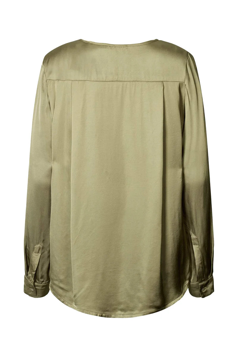 La blusa presenta un corte relajado con una hermosa caída en los hombros, un pliegue trasero que garantiza un buen ajuste y un escote femenino.