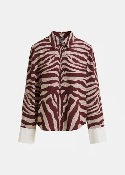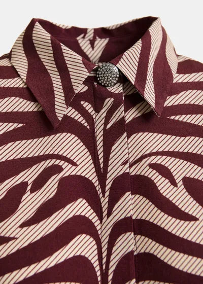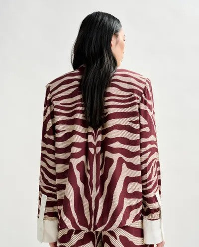 Esta camisa de corte oversize equilibra la estructura con fluidez e incorpora hombreras extraÃbles que esculpen la silueta al gusto. La tapeta está adornada con un botón con pedrerÃa incrustada en el cuello. Confeccionada en un adornado jacquard inspirado en la cebra, la prenda está rematada con un dobladillo redondeado que se presta tanto para llevarla abrochada como desabrochada.