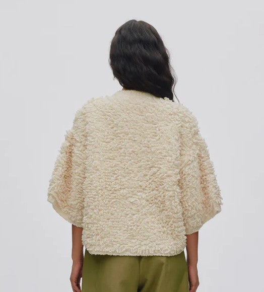 Esta chaqueta de punto de lana de cordero destaca por una textura caracterÃstica y esponjosa que se siente extremadamente cómoda y suave.