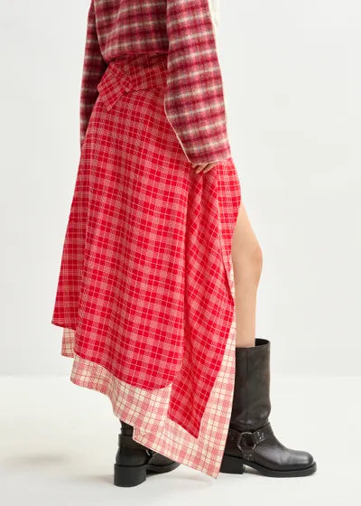 Esta falda de cuadros presenta un diseño deconstruido y divertido para un look único. Presenta un corte holgado con un bajo fluido y asimétrico. Entre sus características únicas se incluyen las mangas camiseras que se envuelven alrededor de la cintura, creando la ilusión de una camisa suelta. Combínala con una blusa blanca o un top ajustado.
