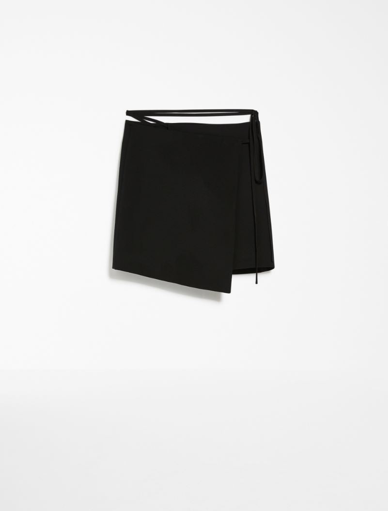 Minifalda cruzada asimétrica confeccionada en tejido de lana elástica de doble cara. El modelo de talle bajo se abrocha mediante detalle de cordones en la cintura. Modelo forrado