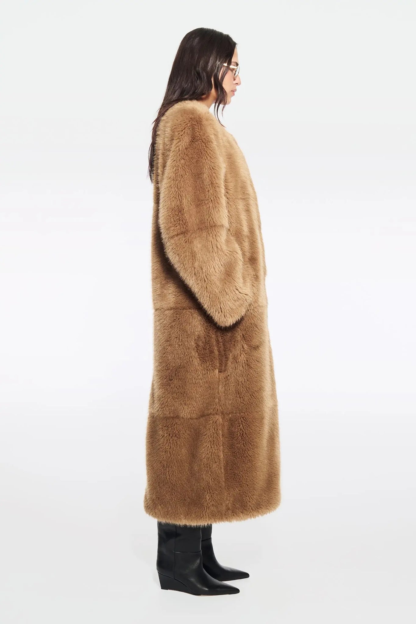 Abrigo largo de silueta recta que luce un patchwork de piel sintética. Está completamente forrado y cuenta con botones frontales ocultos y bolsillos laterales con abertura.