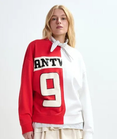Sudadera confeccionada en 100 % jersey de algodón. Presenta un corte holgado y un llamativo diseño de paneles partidos que crea un contraste gráfico. La parte delantera presenta un gran aplique decorativo y letras decoradas con lentejuelas y cuentas para lograr un acabado refinado y sensorial.