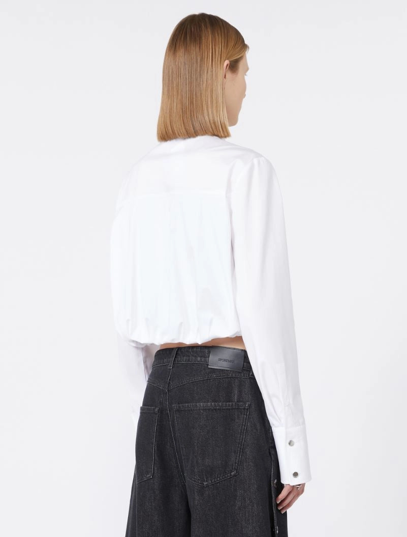Camisa de popelina de algodón puro con cintura corta. El fruncido en el bajo, el canesú cosido y el bolsillo insertado se inspiran en las chaquetas deportivas, reinventadas con un estilo femenino.