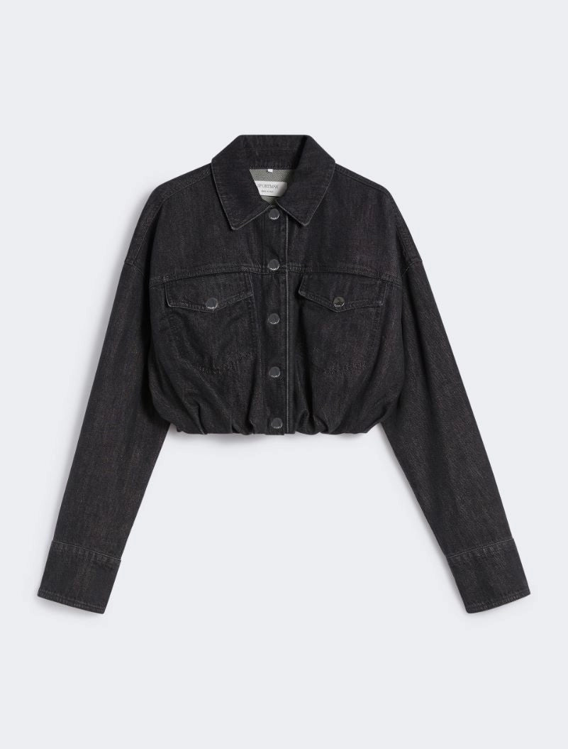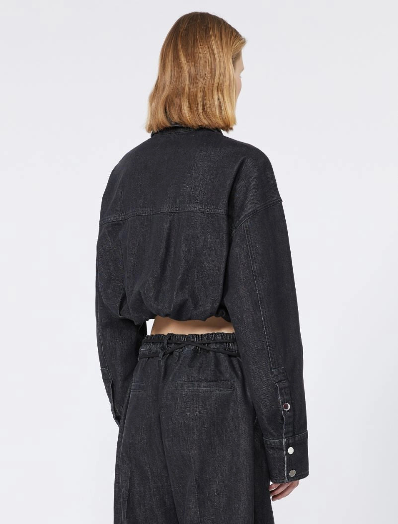Chaqueta vaquera negra, ligera y suave, con volumen realzado por la inserción elástica en el bajo. Las costuras recorren todos los cortes estructurados y realzan los bolsillos delanteros.