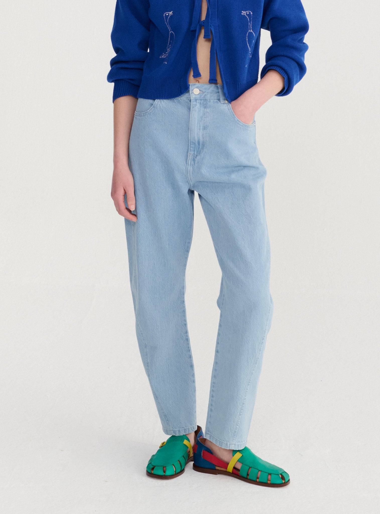 Pantalón de color azul claro. Diseño confortable de corte relajado de estilo cocoon, con bolsillos y confección en tejido no elástico. Tallaje normal, elige la talla habitual. Producto fabricado en Portugal.