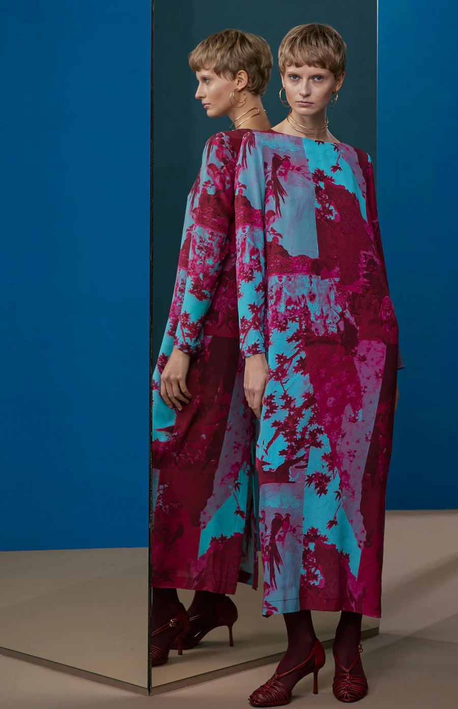 El estampado "Papel pintado" es un collage que amalgama diferentes dibujos originales de pájaros pintados en témpera. Cada diseño de papel de aves y texturas vegetales se va superponiendo, capa sobre capa, imitando una pared con vestigios de diferentes papeles pintados antiguos.