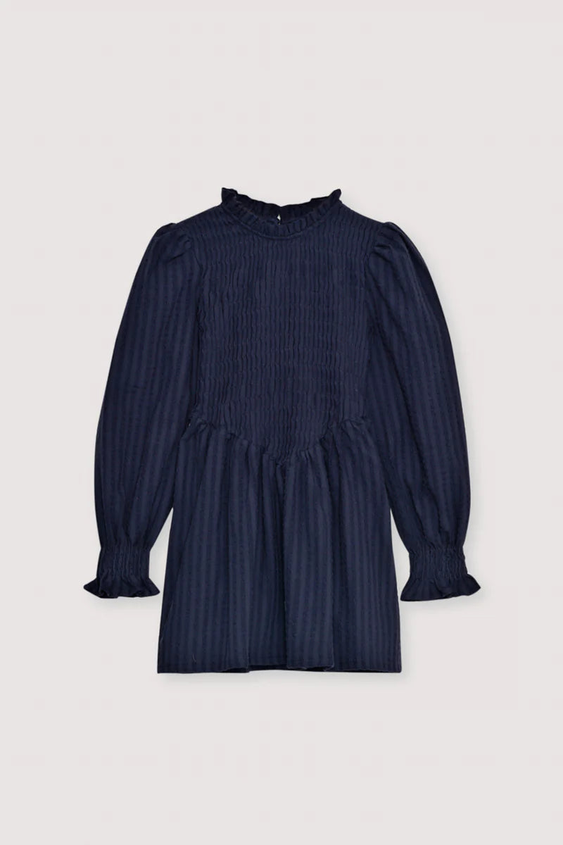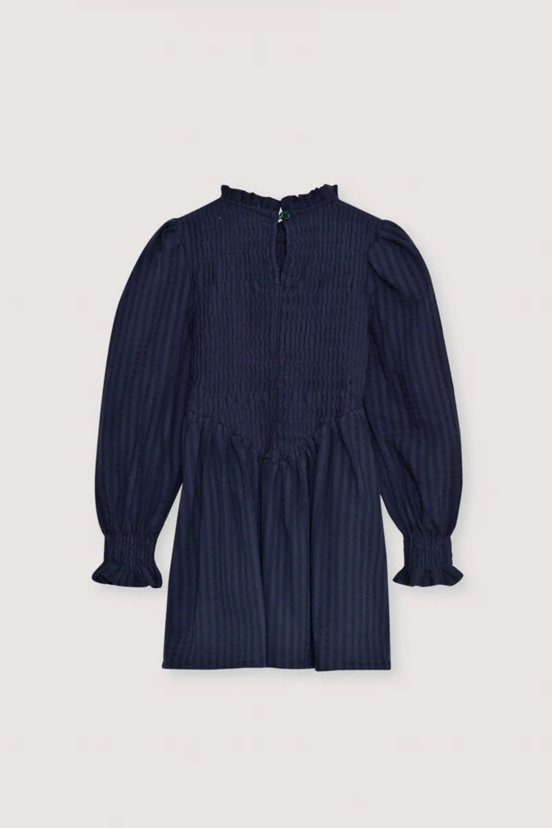 Un encantador vestido corto confeccionado en tela seersucker ligera, con un corpiño fruncido con acabado en forma de V. Diseñado con mangas abullonadas y un escote redondo acentuado con un delicado volante, ofrece un look divertido pero refinado perfecto para el uso diario o para ocasiones especiales.