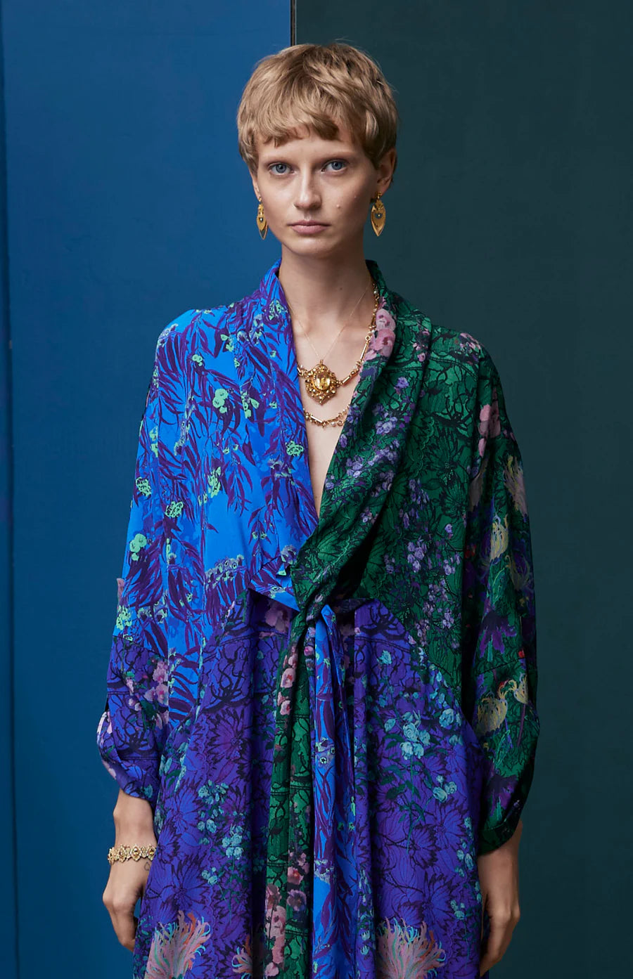 El estampado " Floral sobre encaje" es un dibujo compuesto por diversas flores: malvas, lirios del valle, rosas de Damasco, lirios llorones, fucsias y geranios silvestres.