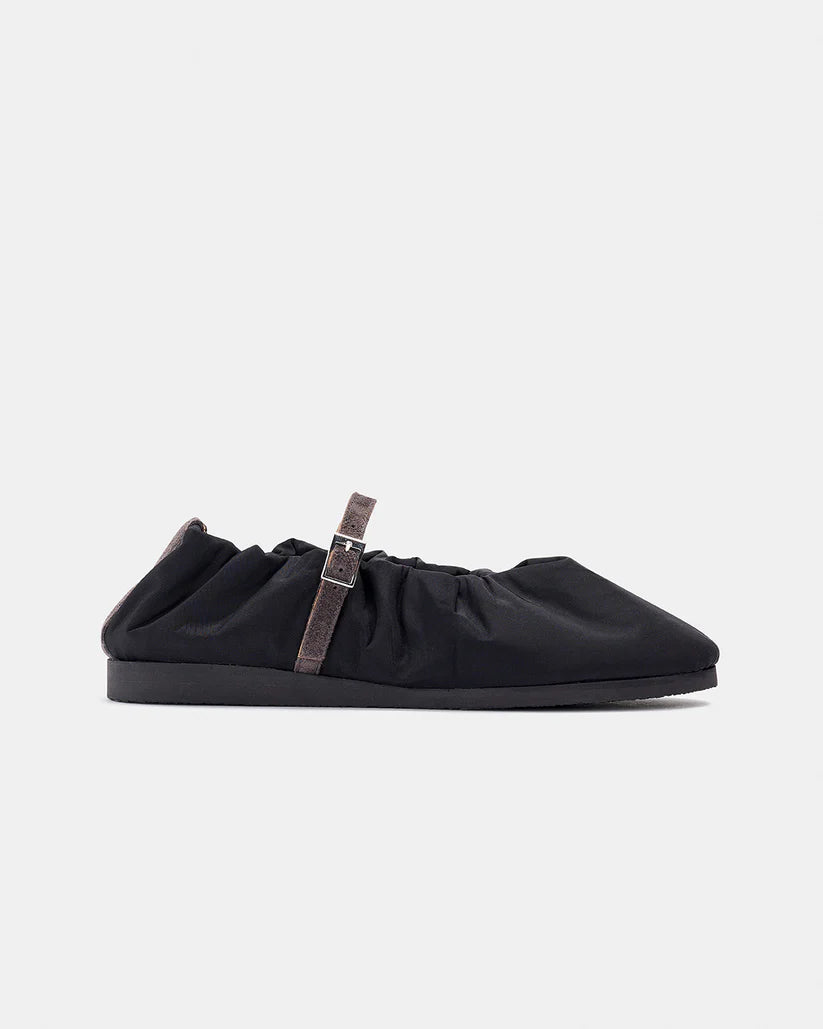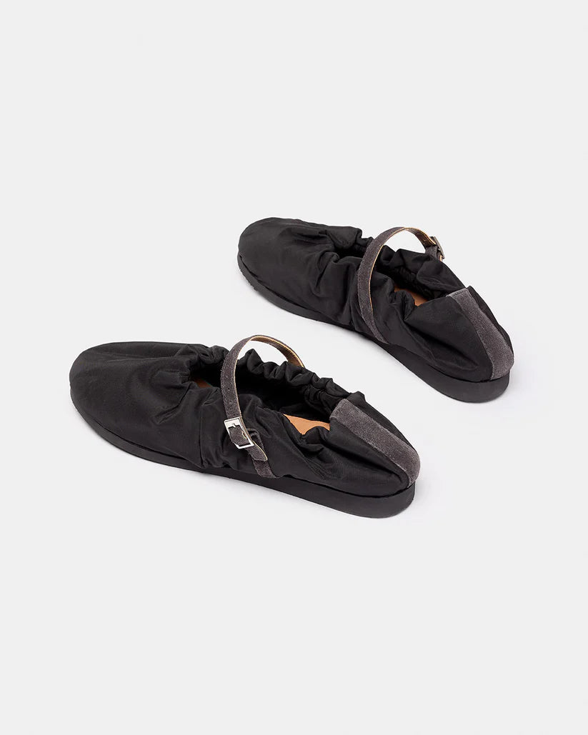 Zapato tipo mercedita con detalle de fruncido en el corte. El material de corte y forro es de tejido técnico sintético. Cierre mediante hebilla, correa de piel serraje. Plantilla acolchada y forrada con piel de vacuno natural. La suela es de goma virgen con cuña. Puntera redonda. Altura de suela 2 cm. Fabricado en España.