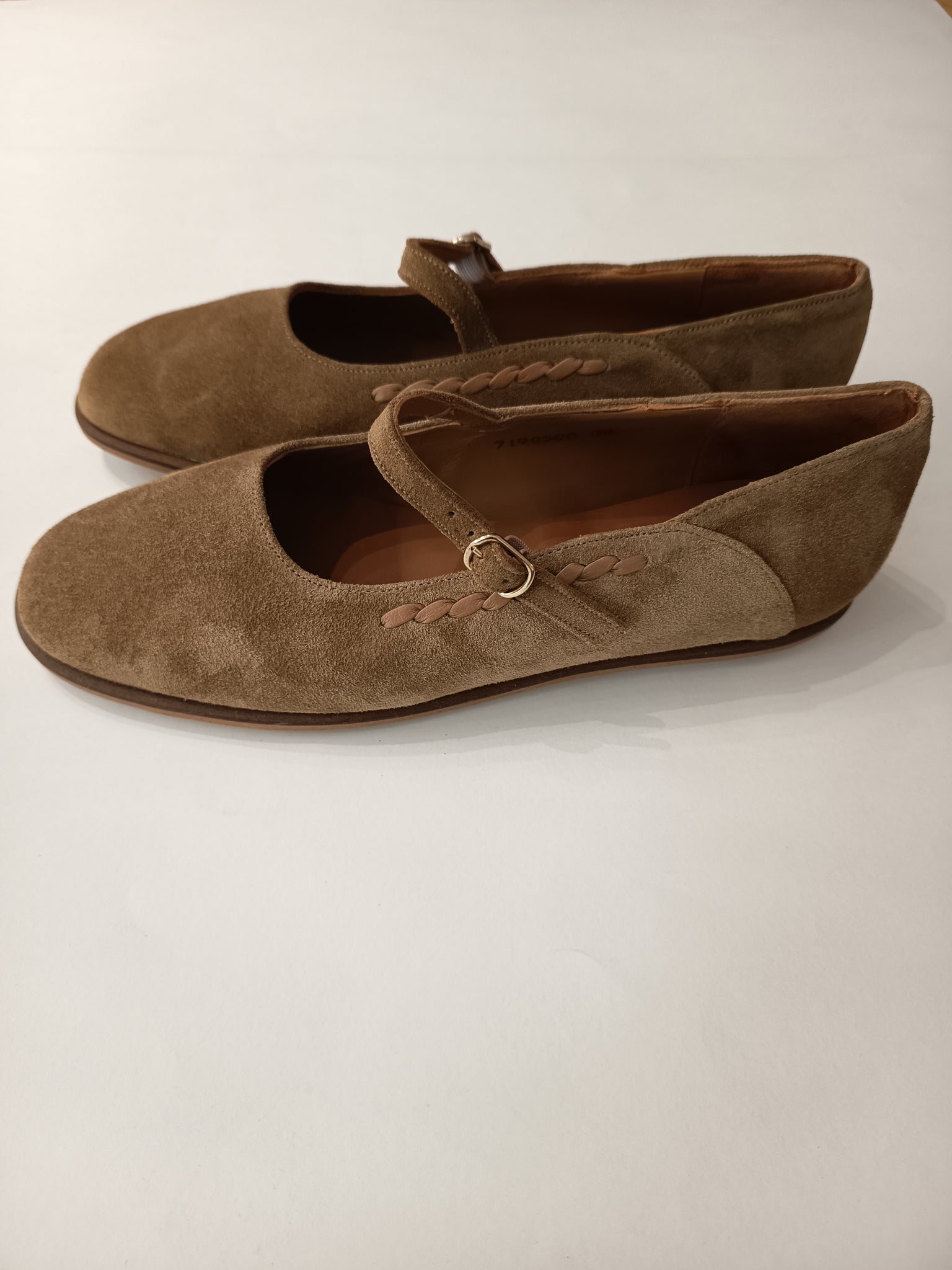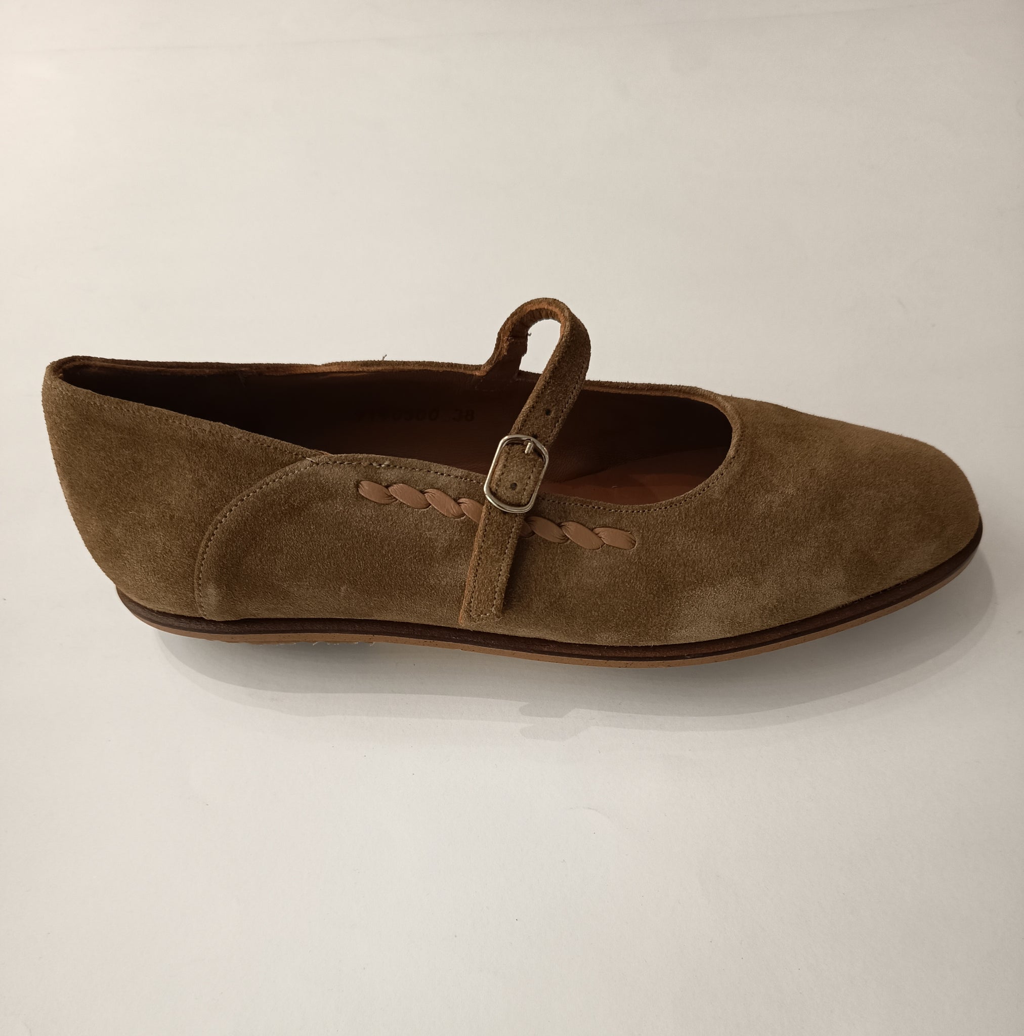 SONIA es un zapato de tipo mercedita. El material de corte es de piel serraje y detalle de trenzado de piel de cabra en el lateral. Cierre mediante hebilla. Forro y plantilla de piel de vacuno natural. La suela es de huella partida de goma virgen, con cerco y entreplanta de cuerolite. Puntera redonda. Altura de tacón 1 cm. Fabricado en España.